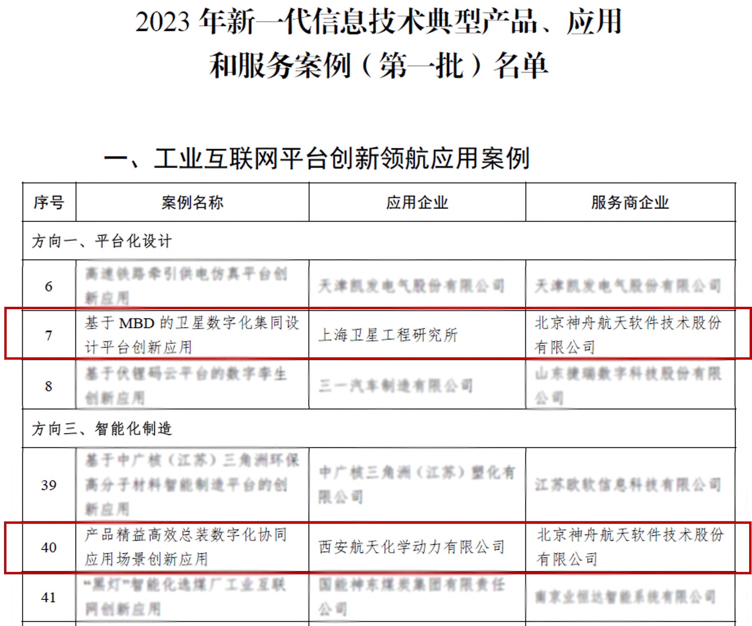 工業和信息化部為了讓更多地方和企業應用新一代信息技術,推動高質量發展提供路徑參考,促進制造業高端化、智能化、綠色化發展,加快推動新型工業化,以新一代信息技術與制造業融合發展為主題,圍繞典型產品、典型應用、典型服務模式等方向,遴選出一批優秀典型案例,并于近期公布了2023年新一代信息技術典型產品、應用和服務案例(第一批)名單,由神軟公司提供服務支撐,上海衛星工程研究所建設的“基于MBD的衛星數字化集同設計平臺創新應用”項目,及西安航天化學動力有限公司建設的“產品精益高效總裝數字化協同應用場景創新應用”項目入選。