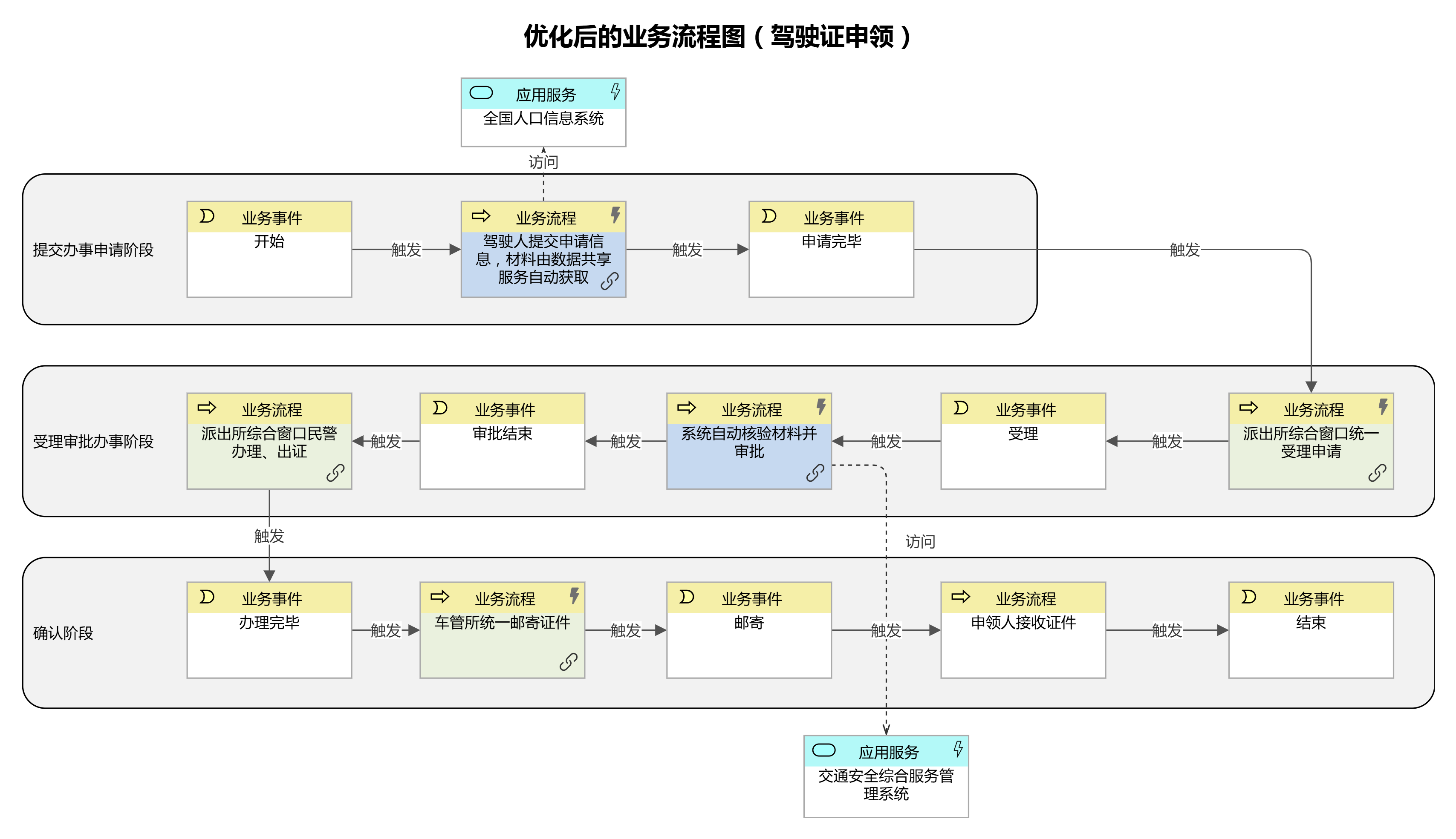 優(yōu)化業(yè)務(wù)流程:謀劃好可集成的數(shù)據(jù)、可協(xié)同的部門后即完成了多跨場(chǎng)景的集成過(guò)程。集成后形成的新流程活動(dòng)替換現(xiàn)行活動(dòng),實(shí)現(xiàn)流程的再造。再造流程將解決重大需求中描述的“堵點(diǎn)”、“卡點(diǎn)”問(wèn)題,因此新流程中的創(chuàng)新活動(dòng)、智能活動(dòng)就是需要改革的項(xiàng)目。